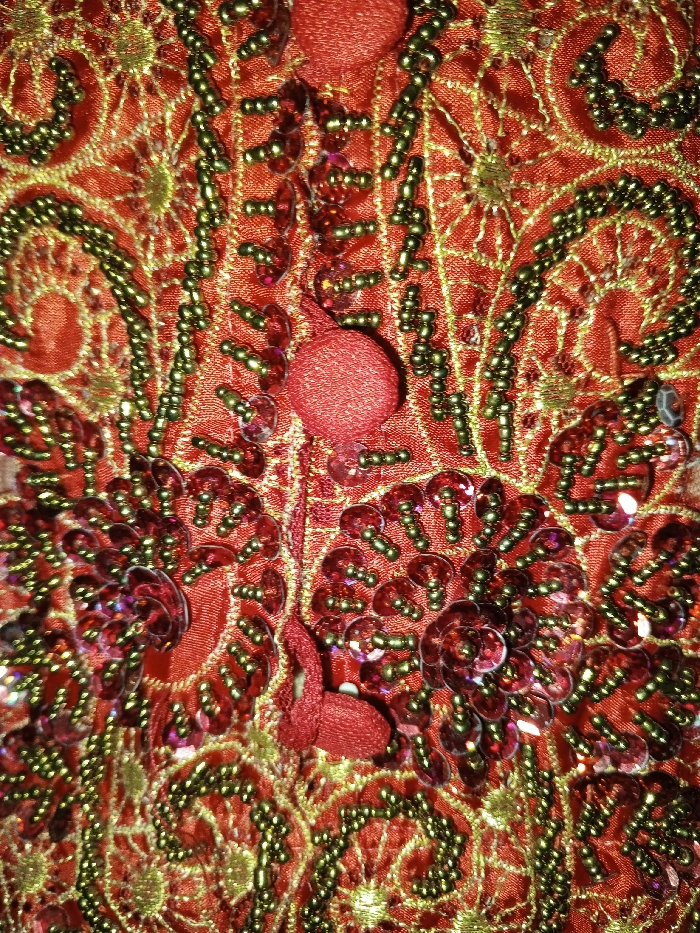 This image presents a forensic, close-up view of an elaborately decorated textile