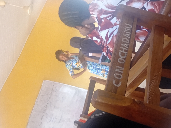 An indoor scene in Ayangba, Nigeria, depicts a classroom or lecture hall. The room features yellow walls, a white ceiling with a single white ceiling fan visible in the upper right, and a white whiteboard mounted on the left wall. Partially legible handwritten text on the whiteboard includes "The Man Who Came to look for you". In the foreground and midground, multiple wooden chairs with attached desks are present. The backrest of a prominent chair in the foreground displays "C.O.N. OCHADAMU" stenciled in white. At least three individuals are visible. A female with dark, curly hair, wearing a short-sleeved blue and green floral patterned dress, stands in the midground with her left hand on her hip and her right hand near her ear, looking downwards. In front of her, an individual is seated with their back to the camera, wearing a dark top. To the right in the foreground, another female is seated, visible from the back and right side, wearing a white, brown, and red floral patterned garment, looking towards the left. A fourth individual's dark shoulder and a zippered garment are partially visible in the lower left foreground.