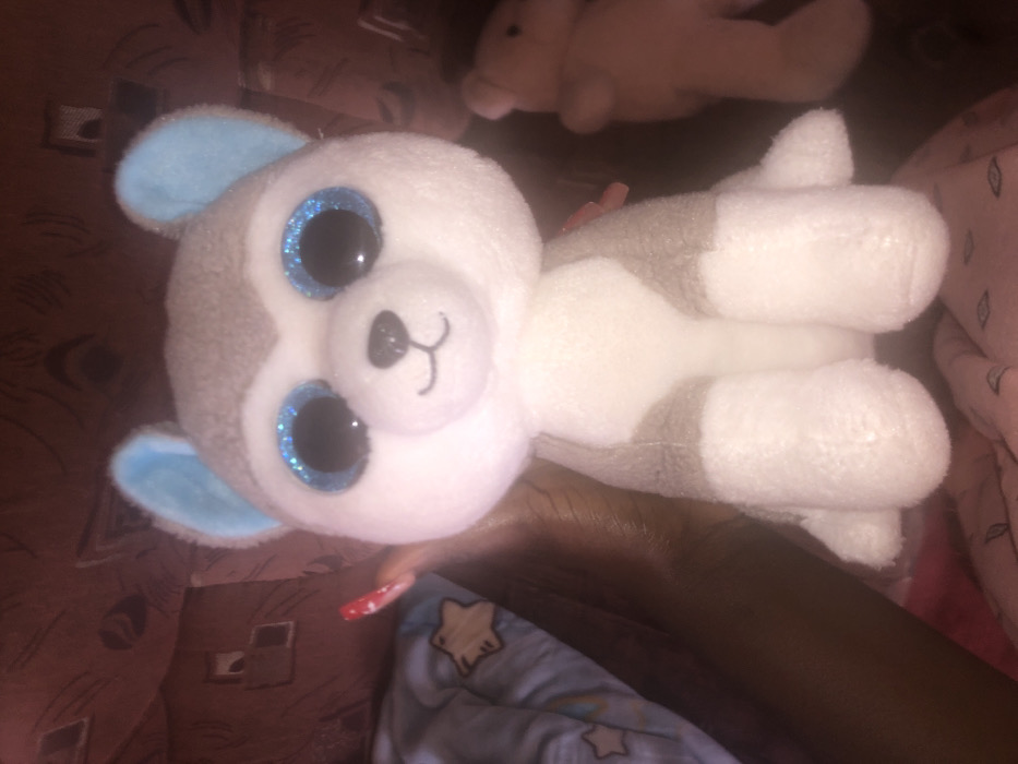 The scene depicts an indoor setting. The specific location within the city of Rido, Nigeria, cannot be determined from the visual evidence. A plush toy resembling a husky puppy, approximately 20-30 cm tall, is centrally positioned and held. The husky toy features white fur on its face, belly, and paws, with gray fur on its head, back, and sides. Its ears are light blue inside, and it has large, black, glitter-encrusted blue eyes, a small black nose, and an embroidered smiling mouth. A human hand, possessing a dark skin tone and long, red-tipped fingernails with white accents, is visible on the left side, appearing to support the plush toy. In the background to the immediate right of the husky, a smaller, light brown teddy bear plush toy is partially visible. Further to the left and behind the husky, a light blue fabric with white and brown star patterns is present. The primary background consists of a reddish-brown, patterned upholstered surface, likely a couch or cushion. The overall lighting is subdued.