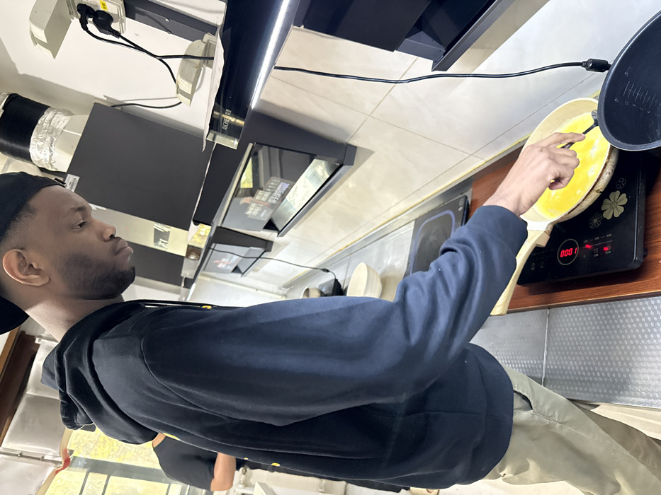 A man in a black hoodie and backwards cap stands in a kitchen. He's stirring a pan of eggs cooking on a portable electric burner. The kitchen appears to have multiple cooking stations with exhaust hoods. A black power cord runs along the wall. The man is facing away from the camera, towards the stove. He wears beige pants. The stovetop is floral themed.