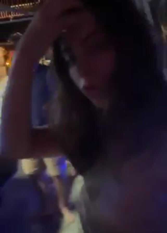 young woman standing in a dimly lit bar or club. She has long brown hair and is wearing a top. Behind her is a pool table with several balls on it. People can be seen playing pool in the background. The lighting in the room is changing colors, shifting between blue, purple, and red. The woman is looking at the camera and appears to be recording a video of herself.