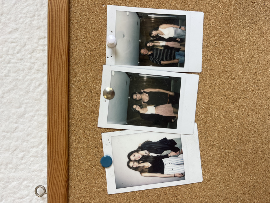 A cork board, light brown in color, serves as the background for three instant-style photographs