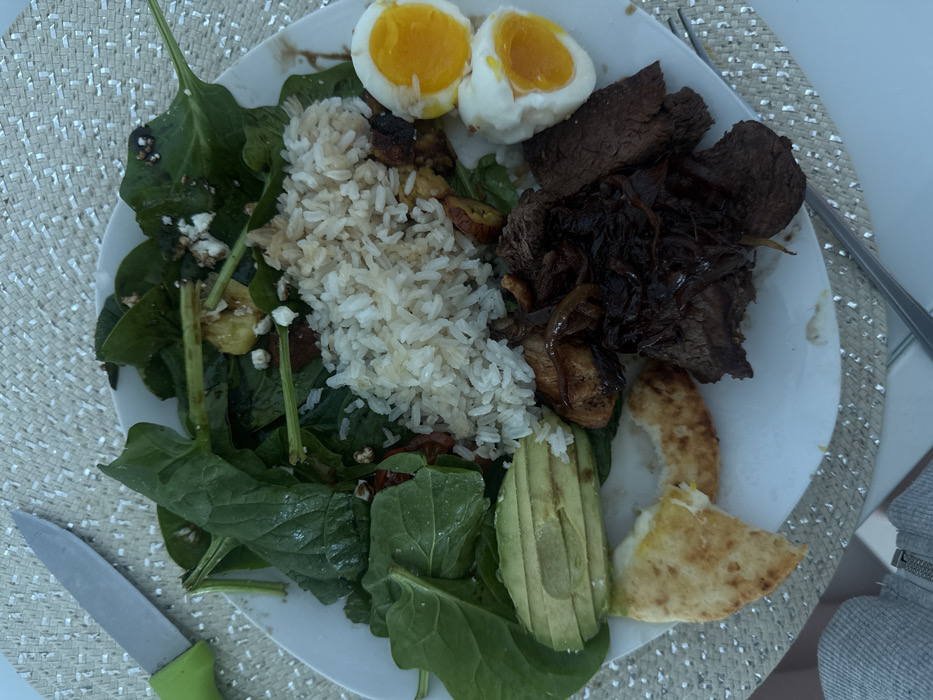 A plate contains a diverse meal. There are two halves of a boiled egg, a mound of white rice, and sliced beef with cooked onions. A spinach salad with feta cheese and sun-dried tomatoes occupies another section, alongside sliced avocado and a piece of cheesy flatbread. A knife with a green handle is visible on the left, and a fork is on the right.