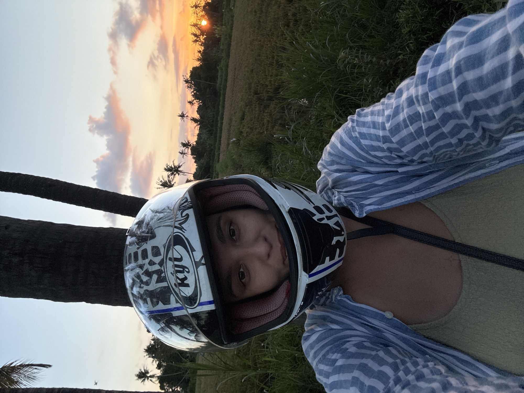 A person wearing a white and black KYT motorcycle helmet and a blue and white striped shirt is facing the camera. The person appears to be in Pering, Indonesia. In the background, there is a field with tall grass and palm trees silhouetted against a sunset. The lighting suggests it is either sunrise or sunset. A palm tree trunk is visible on the left side of the frame.