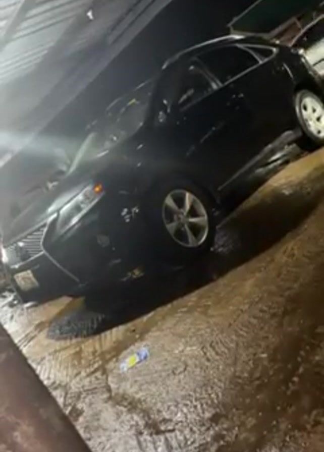 black Lexus RX being washed at a car wash. The car is parked on a wet, concrete surface under a metal awning. There are two buckets near the car. The background shows a street at night with some buildings and a three-wheeled vehicle.
