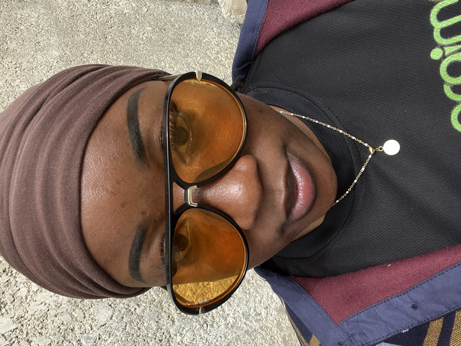 A person with dark skin is depicted in a close-up, head-and-shoulders shot. They are wearing a brown headwrap and large, black-framed sunglasses with orange-tinted lenses. Their eyebrows are well-defined, and their lips are closed. The individual is wearing a black crew-neck shirt, under an open plaid shirt with navy blue, maroon, and yellow stripes. A gold-colored chain necklace with a small, circular pendant is visible against the black shirt. The background consists of a light-colored, rough-textured wall. The scene is located in Fagge A, Nigeria.