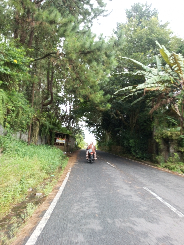 The image displays a two-lane asphalt road in Melakudikadu, India, extending into the distance under an overcast sky. The road surface is visibly damp with scattered wet patches. A solid white line marks the left shoulder, while a broken white line indicates the center of the roadway. A black motorcycle is traveling away from the viewer in the right lane. Two individuals are mounted on the motorcycle; the driver wears a light-colored shirt and a white helmet, and the passenger, seated directly behind, wears a light brown shirt and a light-colored head covering. To the left of the road, a grassy verge and a narrow drainage ditch precede a low concrete wall partially obscured by dense green foliage, including ferns. Further along, a rustic, wooden-framed shelter with a corrugated roof and a light-colored sign is present. Overhead, tall trees, including those with prominent pine needles, form a dense canopy that partially covers the road. To the right of the road, dense tropical vegetation, including large banana plants, lines the roadside. A stone wall is partially visible further along amidst the greenery. The overarching tree canopy creates an archway effect over the road.