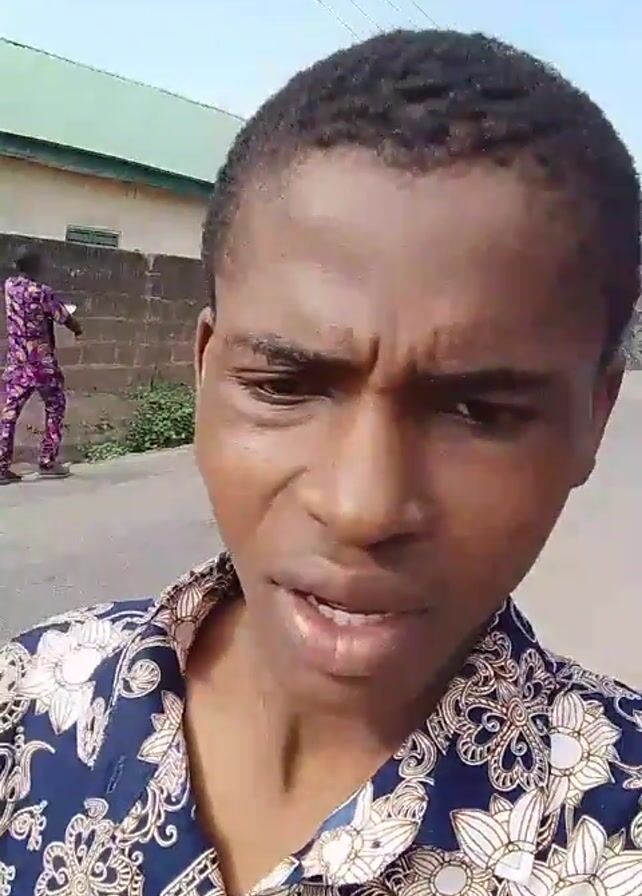 A young man with short dark hair, wearing a blue patterned shirt, is recording a video of himself outside on a sunny day. He is standing on a paved road with buildings and power lines visible in the background. He appears to be speaking and rubs the back of his head at one point. Other people are walking in the background.