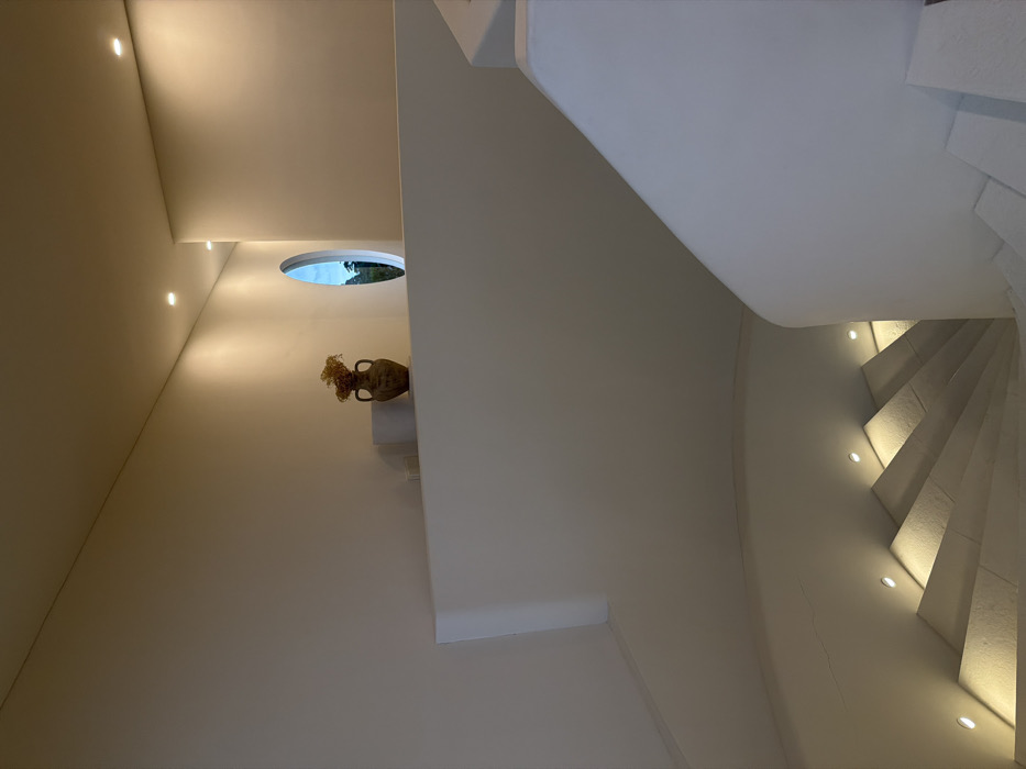 This image depicts a modern, minimalist interior space located in Pecatu, Indonesia. The scene is dominated by a descending, light-colored staircase, possibly spiral, with integrated spotlights illuminating each step along the inner wall. Above the staircase, a white, elevated ledge supports a rustic, two-handled ceramic vase filled with dried light-brown plant material, alongside a smaller white cylindrical object. Further along the upper wall, an oval-shaped window offers a view of vibrant green foliage against a clear blue sky. The ceiling features multiple recessed spotlights providing additional illumination to the upper walls. The walls and structural elements are uniformly light-colored, creating a clean, uncluttered environment. No people, animals, or explicit actions are present in the depicted scene.