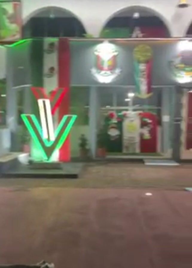 n outdoor scene at night, presumably in Mexico, based on the prominent display of the Mexican flag and related decorations