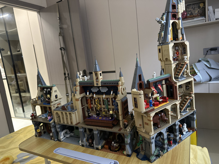This scene depicts a meticulously constructed, multi-level LEGO model of Hogwarts Castle, positioned on a light-colored wooden portable table