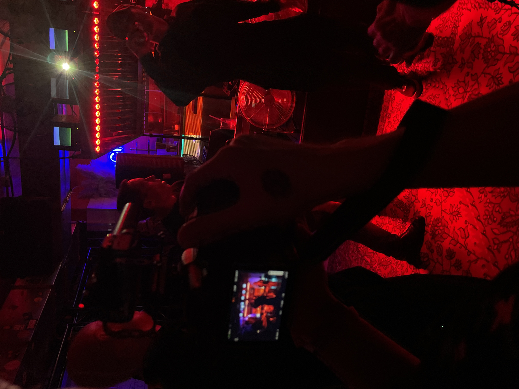 The image displays an indoor venue in Moscow, Russia, characterized by predominantly red and blue artificial lighting. In the immediate foreground, a pair of hands holds a digital camera or smartphone, with its illuminated screen showing a live, somewhat blurred feed of the ongoing scene, featuring figures under purple and red light. To the left, viewed from behind, a bald individual operates a professional video camera, aiming it towards the center. In the mid-ground, a person in dark clothing, facing left, is positioned centrally within what appears to be a performance area or stage. Further right, another individual in dark attire stands with an arm raised, also on the stage. The floor beneath the performers is covered with a distinct red patterned carpet. Stage equipment visible includes a bass drum with a white logo or design on its front, located near the center-right. A circular fan, emitting a red glow, rests on the stage floor to the right of the drum. A tall, dark speaker or sound column is positioned on the left side of the stage. Overhead, a horizontal array of red circular lights illuminates the stage, with additional blue neon lighting and multiple screens or monitors visible in the background. A clear cup containing a straw is present on a surface behind the rightmost performer.