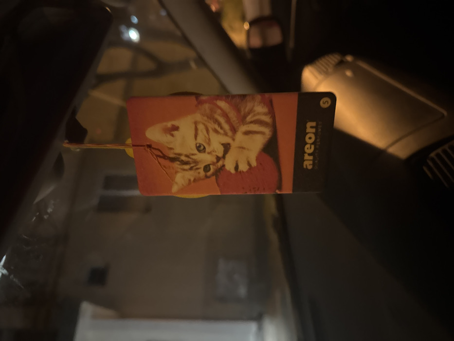 - "An Areon brand automotive air freshener, rectangular with an image of a tabby kitten playing with a red ball of yarn, hangs suspended by an orange string within a vehicle" by FM-JDnYZ2, licensed under CC BY 4.0