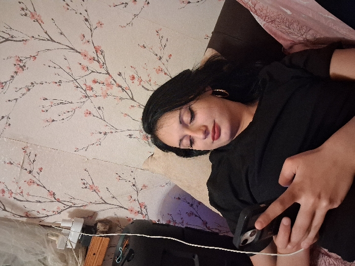 An indoor scene within the city of Lanchkhuti, Georgia, depicts a young adult female reclining, oriented to her left, looking downwards at a dark-colored smartphone held in her left hand. Her right thumb is positioned over the phone's screen. She has dark hair, dark eyeliner, and red lipstick, wearing gold-colored hoop earrings and a black short-sleeved top. The subject is resting against a light beige pillow, with a pink patterned fabric partially visible in the lower right foreground. The background wall is covered with wallpaper featuring pink cherry blossoms on dark branches against a light background. Visible vertical seams and minor edge separation are present in the wallpaper. In the upper left quadrant of the image, a white multi-outlet power adapter is plugged into a wall outlet, with white cables extending from it, positioned above a partial view of a wooden block or shelf fixture.
