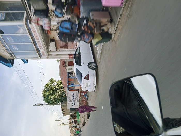 A daytime street scene in Gweru, Zimbabwe, is captured from a vehicle's perspective, with its right side mirror dominating the lower foreground, reflecting dark interior upholstery. The scene features an asphalt road flanked by commercial structures and a dirt shoulder. On the right, a two-story building, identified by a sign as "PRAISE CURTAIN VENTURES," displays numerous backpacks, handbags, and luggage, including a prominent pink suitcase, on exterior racks. An obscured individual is seated near this merchandise. Centered on the left, a white sedan is parked, partially on the dirt shoulder. Further left, a male pedestrian, wearing a purple tunic and trousers, walks away from the viewer on the dirt shoulder, carrying an item on his head. A blue and white sign for "TOSA DIAGNOSTICS MOLECULAR DIAGNOSTICS & RESEARCH LABORATORY" stands behind the white sedan. The background includes various single-story buildings with mixed architecture, a prominent green tree, and a utility pole with overhead power lines against a hazy sky.