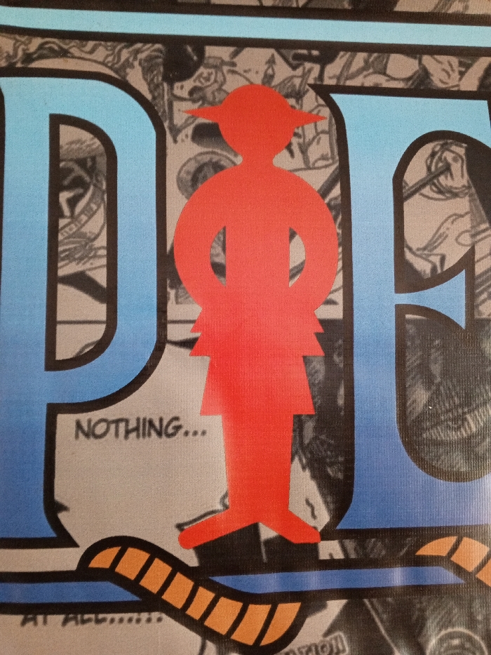 portion of a poster or cover featuring the letters "DPE" in blue, partially filled with a cartoonish, action-filled monochrome background. A stylized red figure with a rounded head and a flat-topped hat overlaps the "PE". The figure has a geometric torso and skirt, and the image is cropped, showing "NOTHING..." and parts of other words from the underlying background. An orange and black patterned element appears at the bottom.