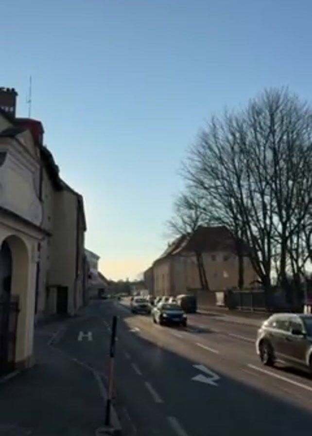 street view with cars driving down a two-lane road on a sunny day. Buildings line the left side of the street, one with an arched doorway. A line of bare trees is on the right side of the road. The sky is blue. There's a sidewalk on the left side of the road. Street markings indicate the direction of traffic.