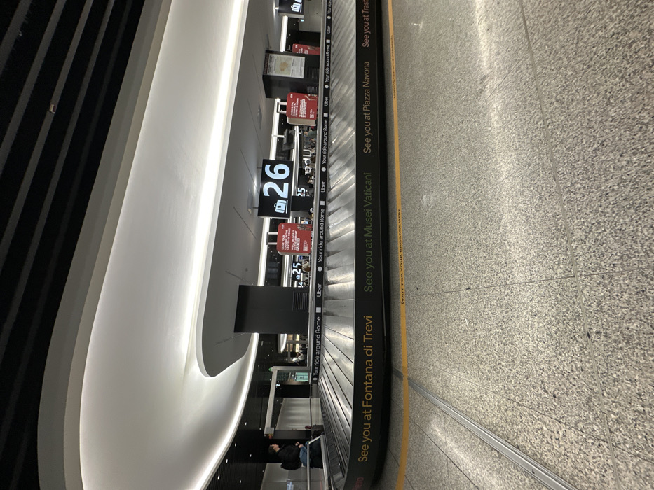 baggage claim area in an airport. Baggage carousel signage displays number 26. Advertisements for Uber rides are visible above the carousels. Slogans promote "Your ride around Rome," and locations such as Fontana di Trevi, Musei Vaticani, and Piazza Navona. The image also shows passengers waiting for their luggage, and information about baggage claim. A striped ceiling is visible. The floor is light grey.