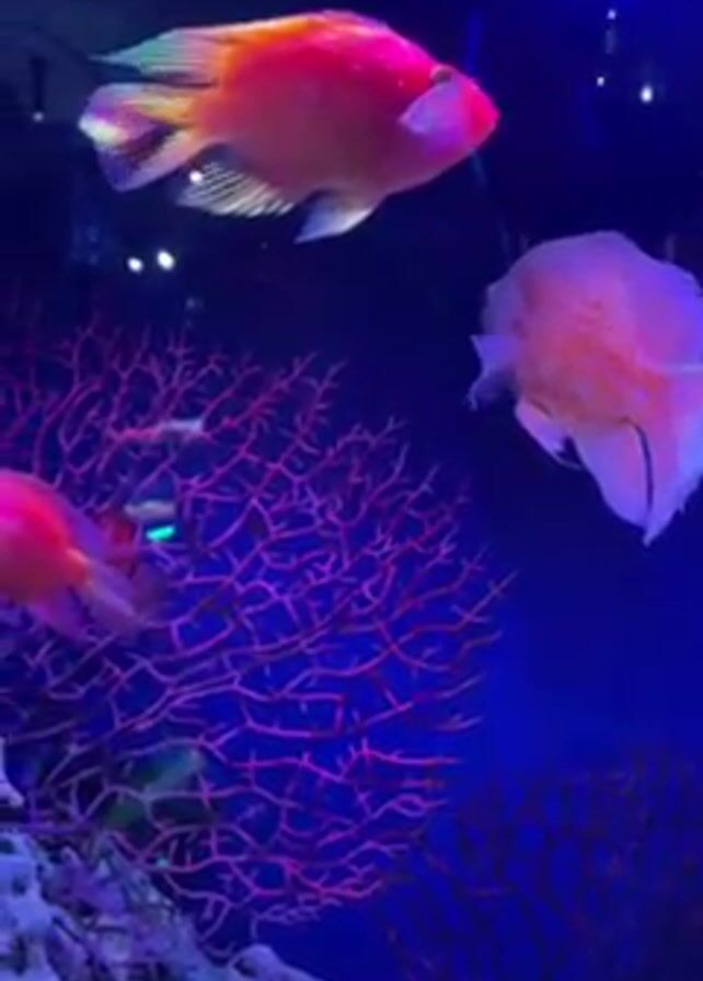 fish tank with multiple colorful fish swimming around. The water is blue and the tank is decorated with artificial coral and rocks. The fish are various shades of orange and pink. The lighting appears to be artificial, with a blue hue. The camera is static.