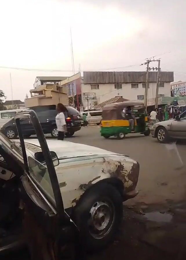 street scene with traffic and pedestrians. A white car, in poor condition with visible rust and the driver's side door open, is parked on the side of the road. In the background, there's a three-wheeled vehicle, a white van, and other cars moving through an intersection. People are walking along the sidewalks and gathering near the buildings. The sky is overcast.