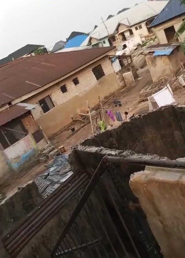 The camera pans up from an elevated, concrete structure to reveal a small neighborhood in what appears to be a developing area