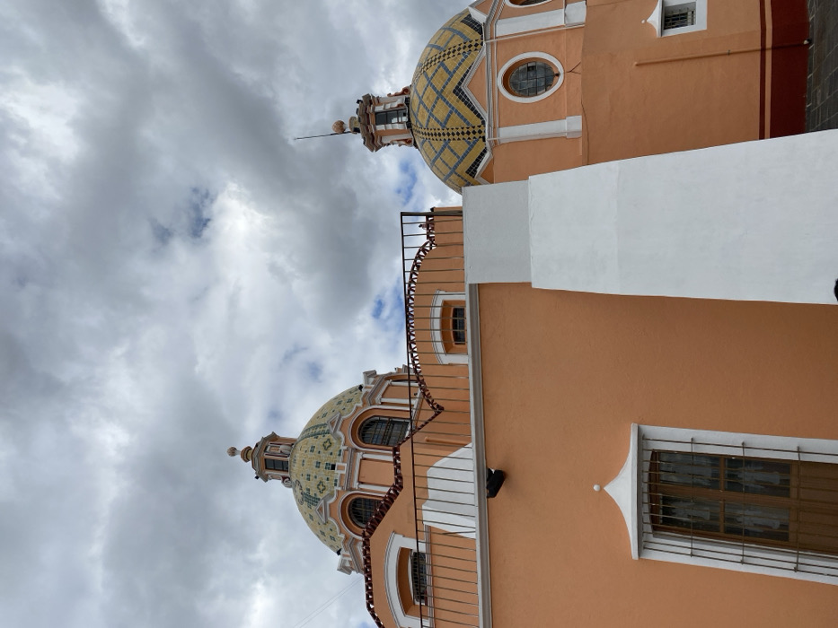 Two ornate domes top a peach-colored building under a cloudy sky. The domes are decorated with a patterned design. The building's architecture features windows with decorative trim and a white wall section. A wrought-iron railing runs along the side of the building. The overall composition is a blend of architectural detail and atmospheric sky.