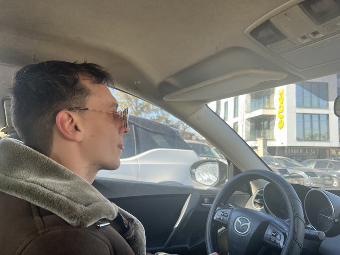The image depicts the interior of a vehicle, viewed from the front passenger seat, looking towards the driver and the exterior environment. A male individual, appearing to be in his 20s or 30s, occupies the driver's seat, shown in profile facing right. He has short, dark hair and wears round, light-rimmed sunglasses with tinted lenses. He is dressed in a dark brown, possibly suede or sheepskin-lined jacket featuring a grey, fur-textured collar and lapels. His left hand is partially visible on the black, three-spoke steering wheel, which bears a Mazda logo in the center and control buttons on its left spoke. The interior roof lining of the car is light-colored, with a sun visor and an overhead console visible. Through the windshield, an urban setting in Sofia, Bulgaria, is observed during daytime under clear, bright skies. Parked vehicles, including a white SUV directly behind the driver's side and multiple dark-colored cars, are visible in the foreground outside the car. In the background, a modern, multi-story white building with extensive reflective windows is prominent. Large yellow Cyrillic letters, spelling "ЗОРОС" (ZOROS), are vertically displayed on the building's facade. Below this vertical sign, the text "HANDER 24_7" is horizontally visible, likely indicating a business or service operating within the building.