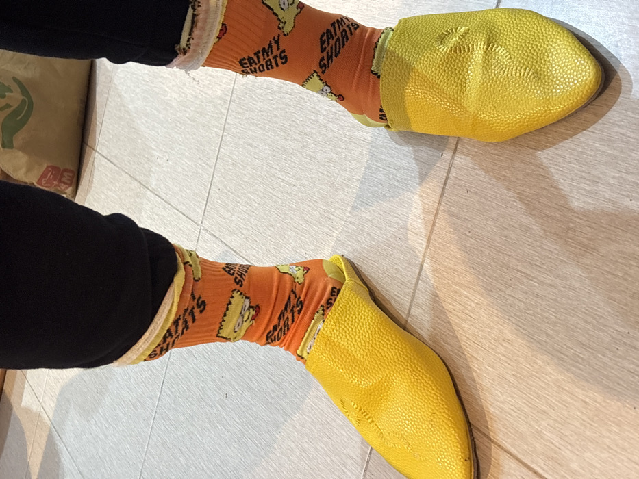A close-up, ground-level photograph taken in Mallalienne ملأليين, Morocco, depicts the lower legs and feet of an individual. The subject wears black pants, slightly bunched above orange crew socks. These socks are patterned with repeated yellow cartoon images of Bart Simpson and the black text "EAT MY SHORTS." Over the socks, the individual wears bright yellow babouches, which are Moroccan-style slippers featuring a pointed toe and a textured, pebbled material. The left babouche's heel is folded down, creating a slide-like appearance, and a faint shadow extends from the left foot onto the light-colored, rectangular tiled floor. In the blurred background, a partial view of a light brown paper bag with a green logo is visible.