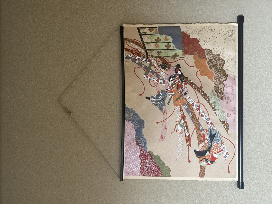 An artwork is centrally mounted on a textured, light brown wall in Nozawaonsen, Japan. The artwork, a print or painting on tan paper with slightly rough edges, depicts three stylized figures in traditional Japanese attire, rendered with intricate patterns resembling collage or fabric applications. The prominent central figure, positioned diagonally from lower-left to upper-right, is a woman in a multi-colored kimono (orange, red, black, white) with elaborate hair. She appears to be reclining or moving, with numerous patterned fabric strips or streamers extending dynamically from her, intertwined with thin red strings. To her left, she interacts with a small, dark, rectangular object. Above and to her left, a second figure in a gray and black patterned kimono is depicted similarly, with flowing fabric strips and red strings. A third, partially obscured figure, also in a patterned kimono (orange, black, white) with streamers, is visible in the lower-left quadrant. The artwork's background features abstract, cloud-like, or landscape elements composed of different patterned papers or fabrics in shades of pink, blue, red, green, and brown. On the right side, a stylized architectural element resembling a dark railing or screen with green and orange accents is visible. The artwork is suspended by a black horizontal bar at the top and another at the bottom, functioning as a scroll hanger. A thin, light-colored cord forms a triangular loop from the top bar to a small, single hook embedded in the wall. A small decorative bell or bead is attached to the cord near the hook. The wall exhibits a faint vertical seam or line extending downwards from the top center.