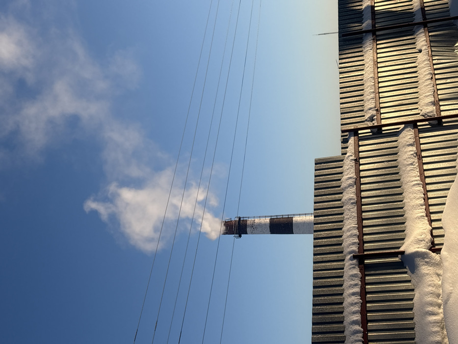 A tall, gray industrial chimney with black and white bands emits white smoke against a clear blue sky with scattered clouds. Power lines stretch across the sky. The chimney is partially obscured by stacked gray corrugated metal panels with rust-colored frames. Patches of snow cling to the frames. The photograph appears to be taken from a low angle, looking upwards.