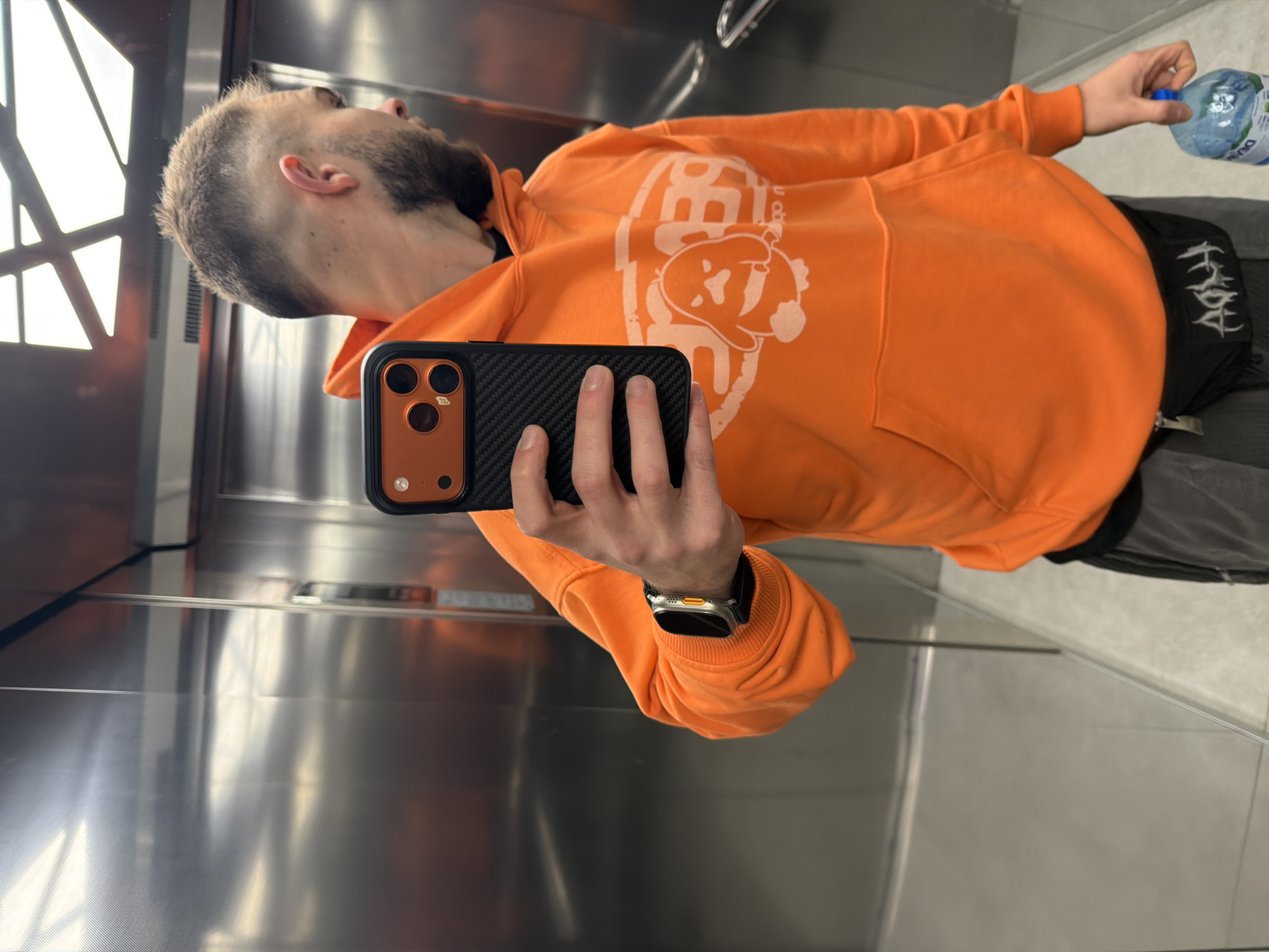 The scene is an interior view of an elevator, characterized by brushed stainless steel wall panels and a geometrically illuminated ceiling. A male subject is positioned in the foreground, facing right relative to the camera, capturing his reflection in the elevator's surface with a smartphone held in his right hand. The phone is black with an orange camera module and a carbon fiber-patterned case, partially obscuring the subject's face. The subject has a short, faded haircut and a beard. He wears an orange hooded sweatshirt featuring a white graphic of a stylized creature and text, including "SBDB" and "indigo n". A silver-colored smartwatch with a black strap is visible on his left wrist. Below the hoodie, he wears grey trousers and a black fanny pack with white stylized lettering. His left hand holds a transparent plastic bottle of water with a blue cap. The specific location within the city of Pernik, Bulgaria, cannot be determined from the visual evidence present in the image.