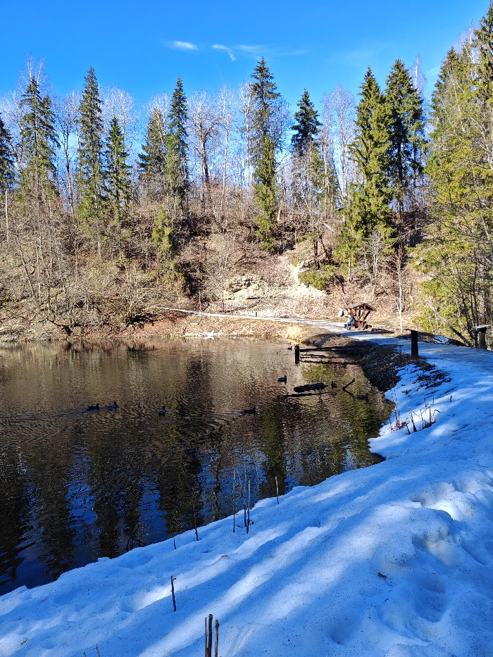 The scene depicts a natural landscape in Lopukhinka, Russia, characterized by a calm body of water, a wooded hillside, and residual snow. The water, reflecting the clear blue sky and surrounding trees, occupies the lower left and central portions of the frame, with approximately six ducks visible swimming on its surface. Along the right bank, a dirt path is partially covered by patches of snow, from which thin, bare plant stems emerge. A small, open-sided wooden shelter with a gabled roof and a bench inside is positioned on this path, where one individual in dark attire is seated. Two dark vertical posts extend from the water near the shelter, and another single post is visible further right along the path. The background features a steep hillside densely covered with a mix of tall, bare deciduous trees and green coniferous trees. The ground of the hillside is visible in places, appearing brown. The sky above is clear and bright blue, with minimal wispy clouds, indicating a sunny day with distinct shadows.
