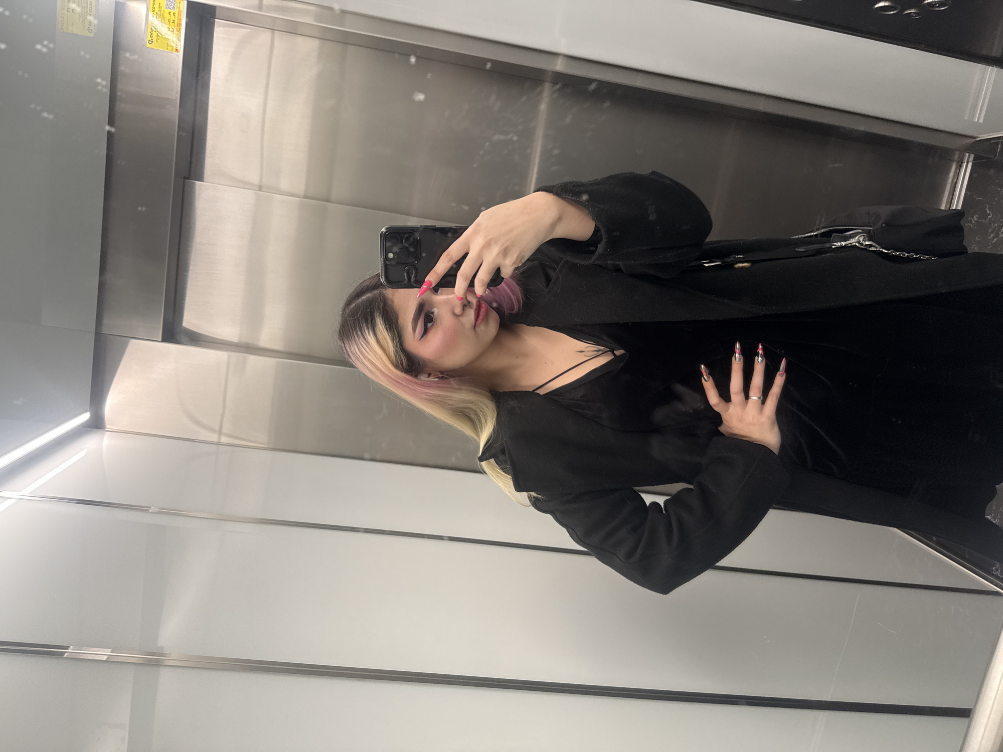 A woman is taking a mirror selfie inside an elevator in Ramat Gan, Israel. She possesses long, blonde hair with visible pink highlights and darker roots. Her visible face features prominent black and pink winged eyeliner, pink blush, a left nostril piercing with a silver ring, and a right eyebrow piercing visible in reflection. She wears a black long-sleeved coat over a black velvet v-neck garment, revealing a faint, dark-colored tattoo on her upper chest. Her left hand is placed on her hip, wearing a silver ring on the ring finger. Her right hand holds a black smartphone with a multi-lens camera array, positioned to capture her reflection. Her fingernails are long, artificially extended, and decorated with intricate black, pink, and silver designs. A small black shoulder bag with a silver chain strap hangs from her left shoulder. The elevator interior features reflective panels, a brushed metal door, and dark-colored, possibly patterned flooring. Overhead linear lighting is present. On the upper right section of the reflected elevator door, two yellow inspection stickers with Hebrew text are visible, including "חירום" (emergency) and "שבת" (Shabbat), indicative of an Israeli elevator.