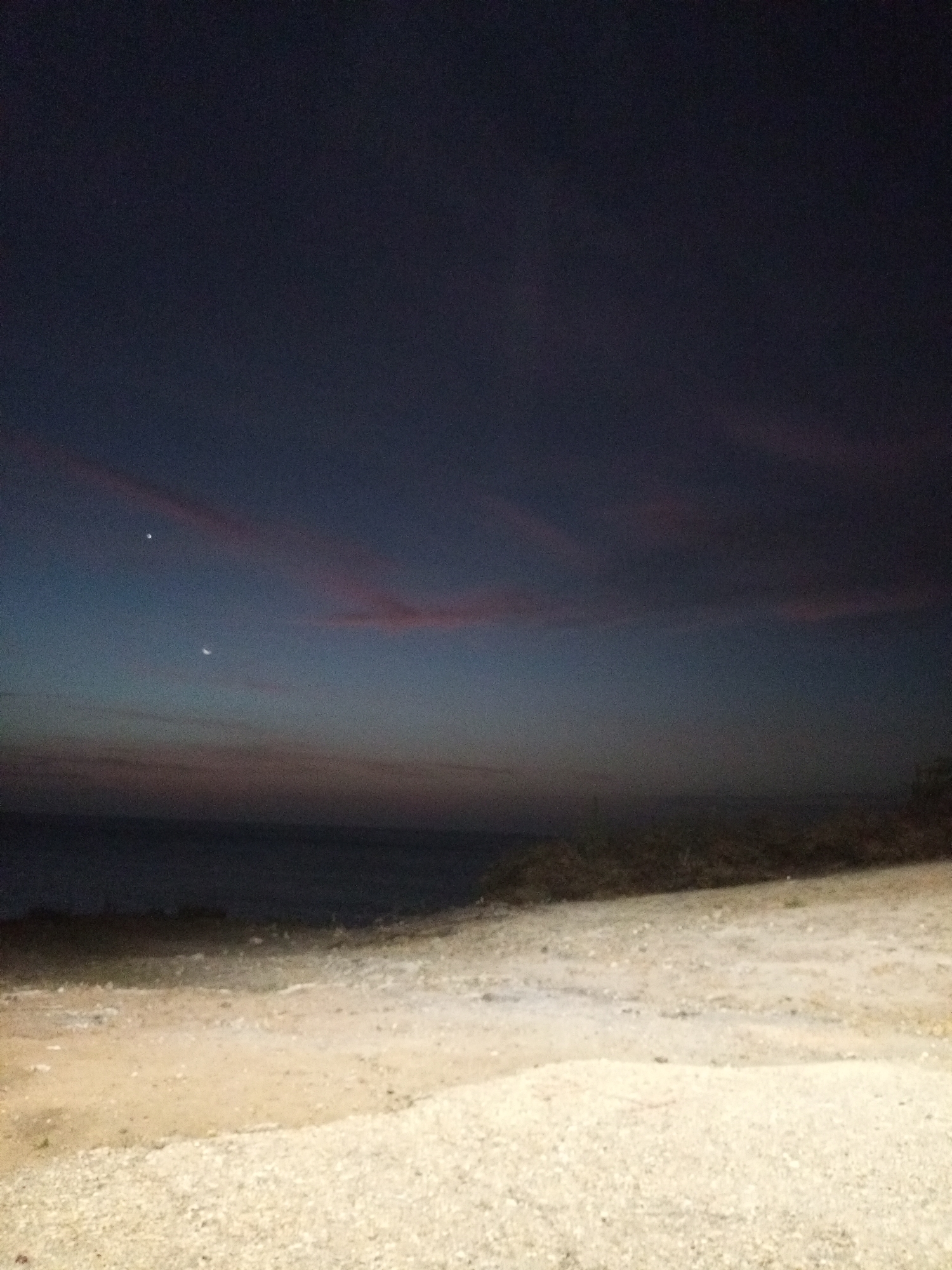 This is a night scene in Juan Griego, Venezuela, featuring a beach and ocean under a dark sky. The sky exhibits varying shades of deep blue and pink hues near the horizon. A crescent moon and another celestial object, possibly a planet, are visible in the upper left quadrant of the sky. The ocean appears dark and still, with a faint horizon line. The beach is composed of light-colored sand and small pebbles, illuminated by an unseen light source. Vegetation is visible along the edge of the beach, blending into the darkness. There are no people visible in the image.