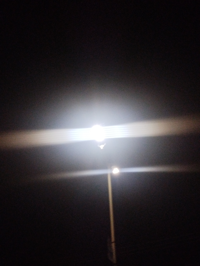 The image depicts a nighttime scene in Unguwan Rimi, Nigeria, dominated by artificial illumination. A bright, unidentifiable light source is centrally positioned in the upper half of the frame, emitting a significant horizontal lens flare across the image. Below and to the right of this primary light, a second, less intense light fixture is visible, attached to a vertical pole, consistent with a streetlamp. The surrounding environment is almost entirely obscured by darkness, with no discernible individuals, objects, or architectural details present. The overall scene is characterized by stark contrast between the intense light sources and the pervasive darkness.