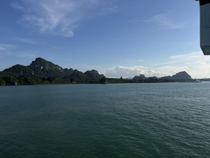 The image displays a panoramic view of a coastal marine environment near Don Sak, Thailand, observed from the deck of a vessel. The upper half of the frame is dominated by a clear blue sky with scattered cirrus clouds in the upper left and more defined cumulus clouds clustered along the right horizon. The lower half features a body of dark teal-green, rippled water, indicating surface movement. A continuous landmass, characterized by densely vegetated, steep-sided karstic mountains and hills, stretches across the middle ground from left to right. The most prominent mountain, situated on the left, is covered in dark green foliage. Two white tower structures are visible on the slope of this mountain. Further right, the land recedes, showing a series of smaller, similarly forested hills. Along the base of the landmass, closer to the water, a faint light-colored strip suggests a road or cleared area. On the far right, at the water's edge near the horizon, a large, multi-decked white ferry or ship is visible, appearing either docked or in transit parallel to the coastline. A partial white structure, likely part of the originating vessel, occupies the extreme right edge of the foreground. No individuals are discernible within the frame.