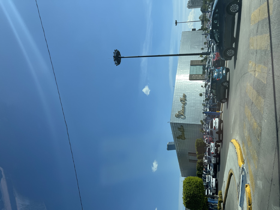 A commercial building labeled "Palacio Hierro" stands beside a parking lot filled with cars. The sky is mostly blue with a few scattered clouds and a tall light pole. An electrical wire is visible on the left. The scene is taken during the day with the sun shining, possibly from inside a car. A yellow curb runs along the right side.