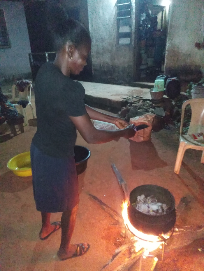 A woman stands outdoors, preparing a meal. She holds a knife and appears to be cutting something near a bag on the ground. A large, dark pot sits over an open fire, contents simmering within. Yellow and black bowls rest nearby. The setting seems like a backyard with a building in the background. It is dim, with the fire providing the primary light source. The woman is wearing a dark shirt, a skirt, and sandals.