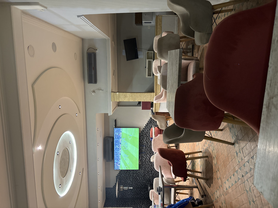 A restaurant or cafe interior is seen with rows of pastel-colored chairs and tables. A large television displays a soccer match. The ceiling features recessed lighting within concentric circles. Another TV is mounted higher in the space. The floor is tiled in a geometric pattern. The overall aesthetic is modern and well-lit.