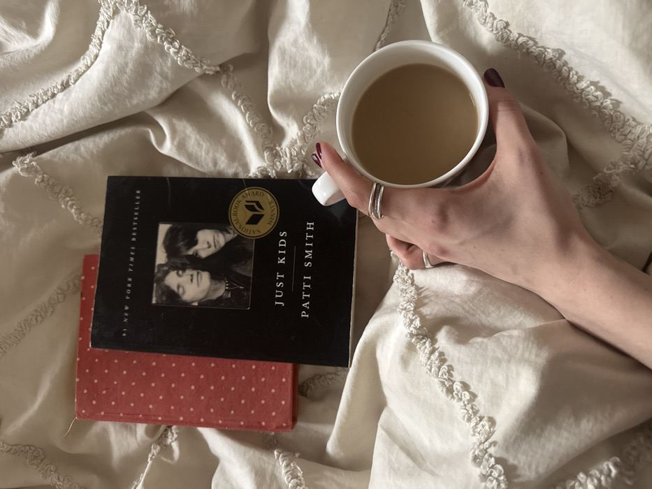 An overhead photograph depicts an indoor scene on a light beige textile surface, likely a blanket or duvet, characterized by decorative ruffled patterns. Two books are central to the composition. The uppermost book is a black paperback copy of "Just Kids" by Patti Smith, featuring a black-and-white portrait of two individuals (Patti Smith and Robert Mapplethorpe) on its cover. Text visible on the cover includes " #1 NEW YORK TIMES BESTSELLER" and a circular "NATIONAL BOOK AWARD WINNER" sticker. A second book, red with white polka dots, is partially visible beneath the Patti Smith memoir. A human hand, with dark red nail polish on the visible fingernails and three silver rings (two on the ring finger, one on the middle finger), holds a white mug containing a light brown liquid, presumed to be coffee or tea. The context provided by the book "Just Kids," a memoir significantly set in New York City, United States of America, suggests an association with that location.