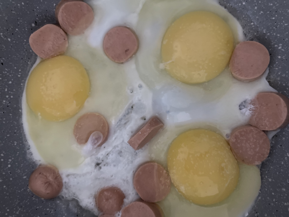 Four fried eggs sit in a gray skillet, their yolks bright yellow against a translucent white. Surrounding the eggs are numerous sliced, pink sausage pieces. The sausages form a border around the eggs, some partially submerged in the egg white. One sausage piece appears to be cut in a rectangular shape, contrasting with the round slices. Bubbles and irregularities are visible in the egg white and on the skillet surface.
