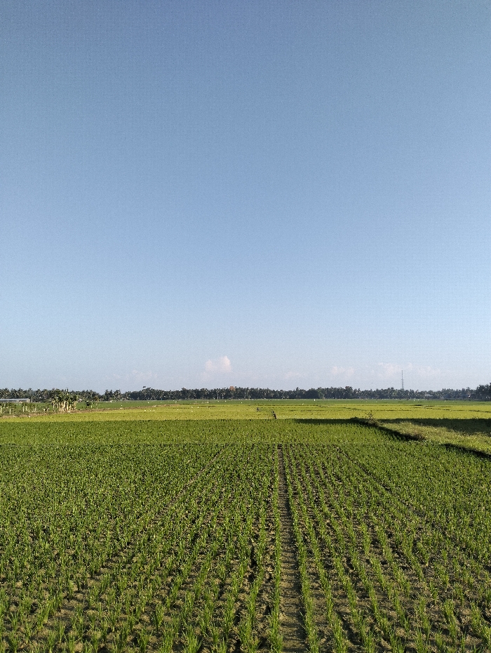 A vast agricultural landscape under a clear blue sky. Rows of young rice plants dominate the foreground, their green blades creating a textured pattern. Beyond the cultivated fields, a line of trees marks the horizon, suggesting a distant forest or village. The light is bright and the air appears clear, indicating a sunny day. A small figure can be seen walking in the middle of the field.
