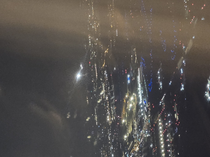The image displays an elevated, oblique aerial view of a nocturnal landscape in Roissy-en-France, France, consistent with the area around Charles de Gaulle Airport (CDG). The scene is illuminated by extensive artificial lighting under dark, hazy or cloudy atmospheric conditions, with notable light diffusion and reflections present on what appears to be an aircraft window, particularly in the upper and right portions. The mid-ground and foreground reveal a composite of urban and airport infrastructure. To the left, a dense cluster of white, yellow, and red lights delineates roads and buildings, indicative of a populated urban area. The central and right sections distinctly feature the airport environment, characterized by precise patterns of blue lights marking taxiways and runways, alongside numerous white and red lights indicating various airport facilities, aprons, and guidance systems. Brighter, concentrated clusters of white and yellow lights suggest large structures like terminal buildings or operational centers within the airport complex. A prominent, diffuse bright light source is visible in the upper center, possibly an external ground light or reflection. No discernible human figures or specific aircraft are present. The scene implies ongoing activity within both the urban and airport landscapes, with vehicular movement on illuminated thoroughfares and airport operational zones.