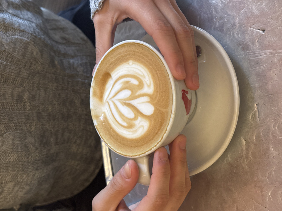- "A close-up, top-down perspective depicts two hands holding a white ceramic coffee cup containing a latte or cappuccino with white foam latte art forming a symmetrical multi-leaf or heart pattern" by FM-T99Iv1, licensed under CC BY 4.0