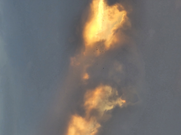 An elongated plume of golden-yellow clouds pierces through a predominantly gray sky. The cloud formation is vertical and appears to be illuminated from within, giving it a glowing effect. Several dark, small shapes, possibly birds, are scattered around the top section of the golden cloud. The rest of the sky shows various hues of gray, hinting at either a stormy or dusky atmosphere.