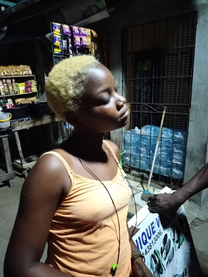 A young woman with blonde hair stands in front of a dimly lit shop