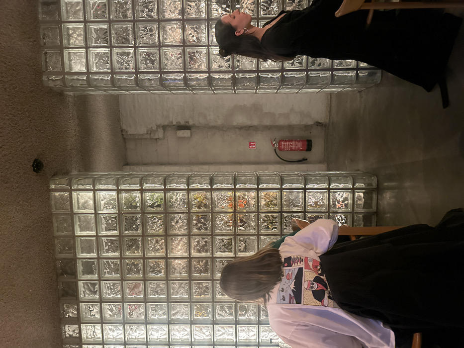 The image depicts an interior scene at Ristorante Standard in Antwerp, Belgium. The environment is characterized by an industrial-chic aesthetic with subdued lighting. Two prominent, vertical partitions constructed from square, translucent glass blocks define a central passageway. The glass blocks feature a textured surface, diffusing light and reflections. The visible wall surfaces beyond these partitions are rough, light-grey concrete or brick, showing signs of distressed texture. On the left, a person is seated with their back towards the camera. They have medium-length, straight hair and are wearing a white long-sleeved shirt with a multi-panel graphic print on the back. The print includes imagery resembling Japanese art, depicting Mount Fuji, a figure with a bandana, and a red car. A dark garment is draped over the back of their chair. On the right, partially visible in profile, a second person is positioned, facing right. They have dark hair styled into a bun or ponytail and are wearing a dark, long-sleeved dress. Silver hoop earrings are visible on their ears. In the narrow passageway between the two glass block structures, a red fire extinguisher is mounted on the light-grey wall, beneath a small white square sign with a red border. The floor is dark and smooth, likely polished concrete. The ceiling above is textured and light-colored, featuring a dark circular fixture.