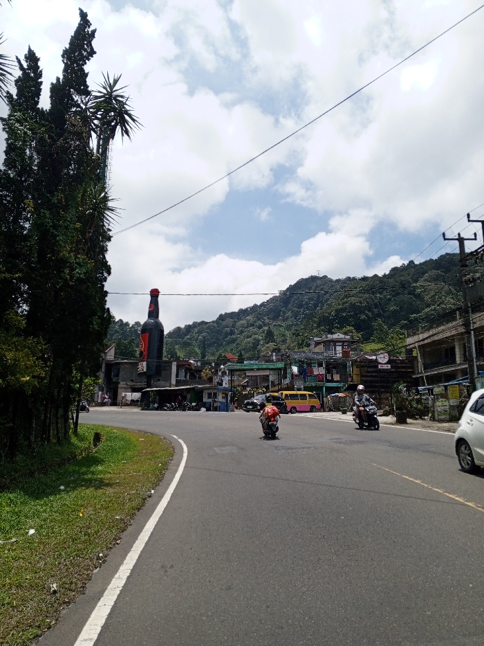 This image depicts a daytime street scene in Multhan, India, featuring an asphalt road curving to the right, bordered by a grassy verge on the left. Overhead, a partly cloudy sky with patches of blue is visible. In the foreground and midground, two individuals on motorbikes are present on the road; the central motorcyclist is carrying a large, bundled item secured behind them. A white car is partially visible on the far right. To the left, a cluster of tall, dark green coniferous and palm-like trees lines the roadside. Across the road, a series of multi-story buildings are visible, topped by a large, dark-colored bottle-shaped structure with a red cap, serving as a prominent landmark or advertisement. A yellow and pink van is positioned near these buildings. The background is dominated by a densely forested mountain range. Multiple utility poles and power lines extend across the upper portion of the frame.