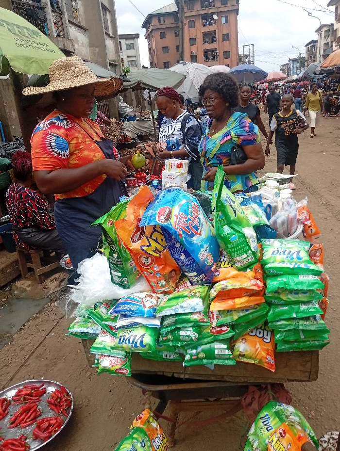 The image depicts a bustling street market in Onitsha, Nigeria, characterized by numerous vendors, customers, and goods. In the foreground, a dark-skinned woman wearing a wide-brimmed straw hat, an orange and blue tie-dye shirt, and a dark apron stands behind a stall, engaged in interaction. Her left hand is near a light green fruit, possibly a citrus. To her immediate left on the ground, a silver platter contains numerous bright red chili peppers. The central feature of the foreground is a wooden cart serving as a display for a large quantity of packaged goods, primarily colorful pouches of detergents and household items. Brands such as "MAM," "Viva Plus," and "Joy" are discernible on the green, orange, and blue plastic packaging, stacked high on the cart. In the midground, two dark-skinned women are present as customers. One woman, with red braided hair, wears a white and black shirt with "GIVE LOVE" text and looks down at items on the stall. Adjacent to her, a second woman with dark, curly hair and glasses wears a vibrant, multi-colored patterned dress and carries a dark handbag, also looking towards the vendor. The market street itself is unpaved, appearing as a dirt path. Various other market stalls, some topped with large umbrellas (one green umbrella bears "GLO" branding), line the street, extending into the background. Several individuals, including adults and children (one child wears a yellow and black "Lakers 24" jersey), traverse the path, indicating ongoing market activity. In the background, multi-story urban buildings, primarily brown and grey, rise above the market stalls under an overcast sky, suggesting an urban commercial or residential district.