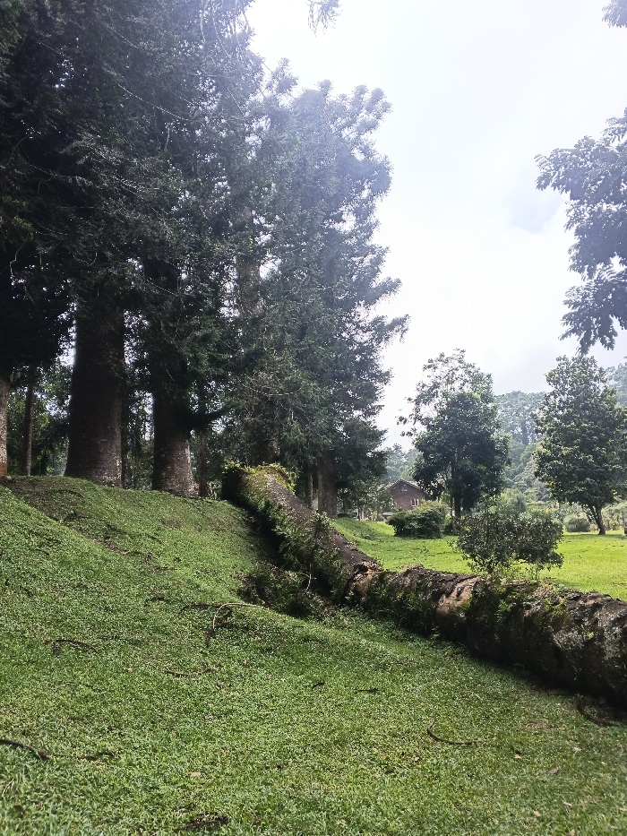 The scene is located in Kwekwe, Zimbabwe, depicting a natural or landscaped environment. The foreground features a steep grassy slope covered in closely mown green grass, with sparse brown debris. A large, weathered tree trunk, covered extensively in green moss and minor vegetation, lies diagonally across the mid-ground, extending from the lower left towards the mid-right. Behind the fallen trunk, a row of tall, dense conifer trees with visible dark trunks forms a treeline on an elevated ridge. In the background, beyond the treeline, a small, reddish-brown building with a dark roof and a chimney is partially visible amidst additional scattered trees. The sky above is uniformly overcast and bright. No human presence or activity is observed within the frame.